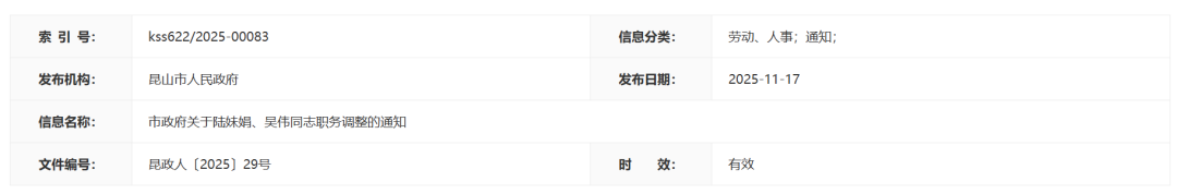 近日,昆山市人民政府发布昆山市第一人民医院院长、副院长最新职务调整。