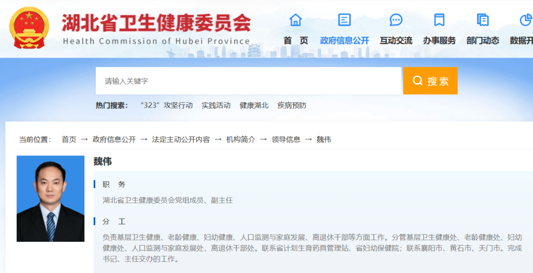 近日,“湖北省卫生健康委员会”网站更新显示,魏伟已任湖北省卫生健康委员会党组成员、副主任。